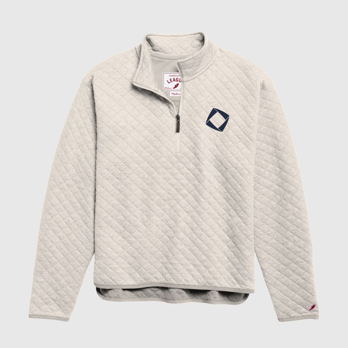 This stylish quarter zip features all-over diamond quilting, curved hi-low hem, exposed zipper and set in sleeves.
