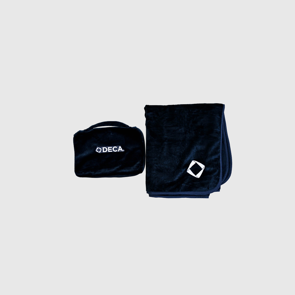 Soft navy blanket and zippered pouch with white embroidery. The blanket is 57 3/4 x 35 3/4 inches. Pouch has a carrying handle making it convenient for travel.